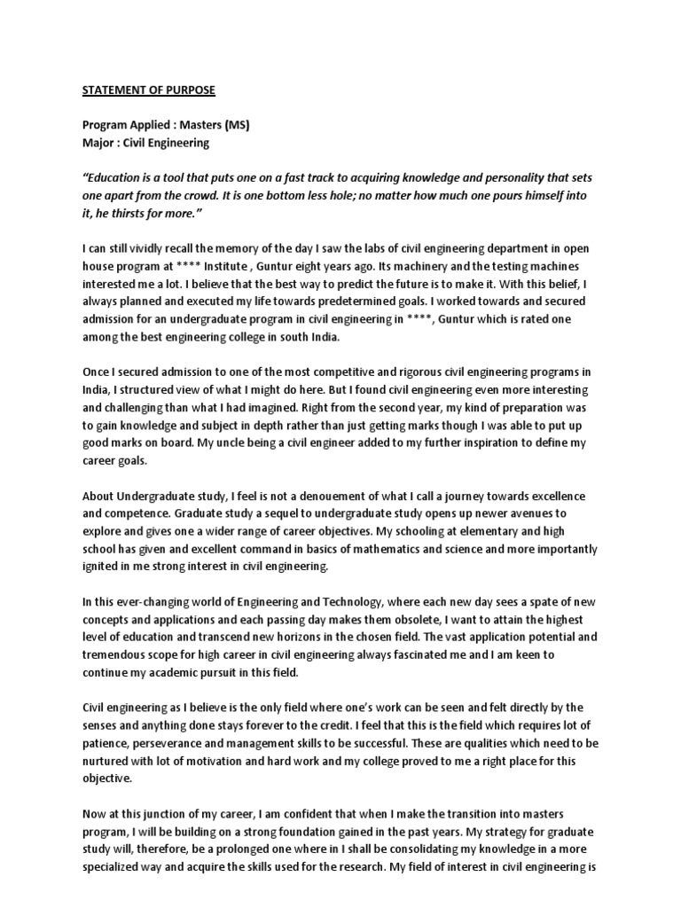 1) a short narrative about your scholarly interest and what drove you to study in this field. How to write statement of purpose? A good statement of purpose should reflect your personality, creating a bridge between your past experiences and future goals.
